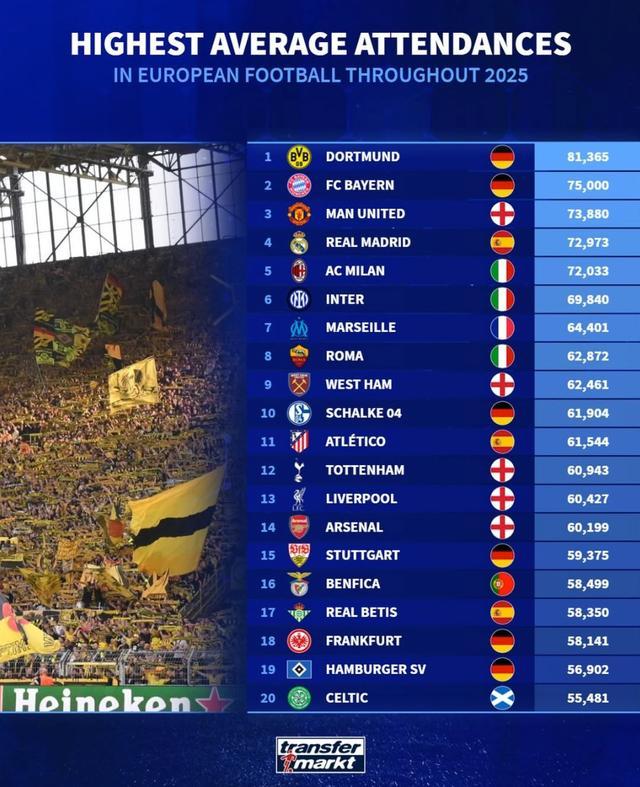 2025年欧洲俱乐部场均上座人数:多特、拜仁、曼联前三
